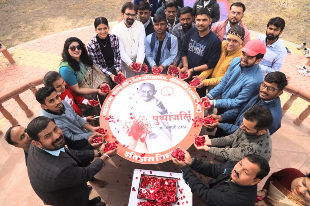 राष्ट्रपिता महात्मा गांधी को उनकी पुण्यतिथि पर एमजीएसयू में इतिहास विभाग के नेतृत्व में शिक्षकों, अधिकारियों व विद्यार्थियों ने पुष्पांजलि अर्पित कर उनके प्रति श्रद्धा व्यक्त की। पुष्पांजलि कार्यक्रम की आयोजनकर्ता इतिहास विभाग की सह प्रभारी डॉ॰ मेघना शर्मा ने बताया कि विश्वविद्यालय के विद्यार्थियों ने अहिंसा पार्क स्थित गांधी जी की प्रतिमा के प्रदक्षिणा पथ पर हाथों में गुलाब की पंखुड़िया व बैनर लेकर मार्च किया। गांधीजी के प्रिय भजन रघुपति राघव राजाराम की प्रस्तुति रामोवतार उपाध्याय द्वारा दी गई। तत्पश्चात पार्क स्थित गांधीजी की आदमकद मूर्ति के समक्ष पुष्पांजलि अर्पित की गई व दो मिनिट का मौन रखा गया।