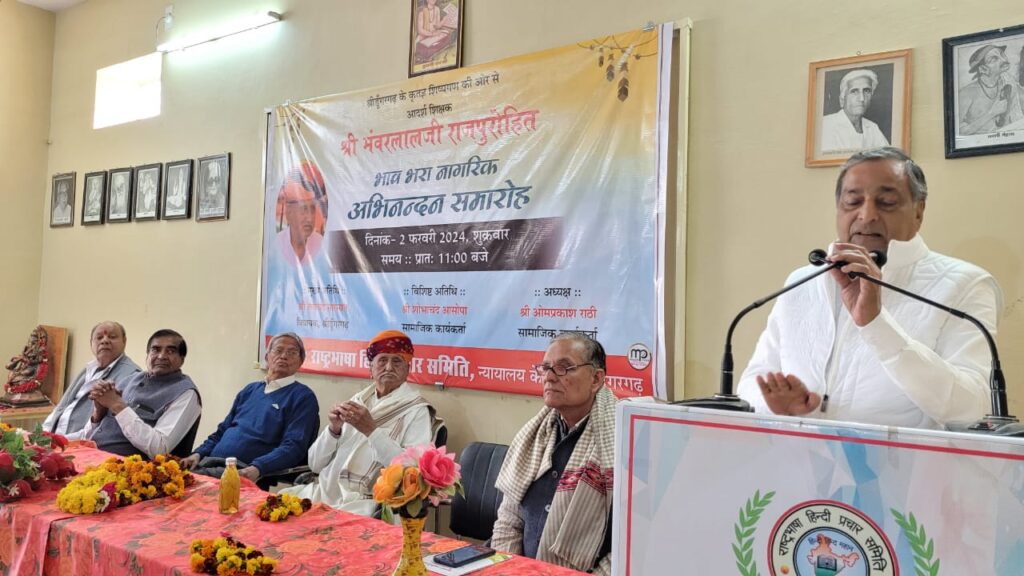 श्रीडूंगरगढ़। शुक्रवार को राष्ट्र भाषा हिन्दी प्रचार समिति के प्रांगण में 92 वर्षीय आदर्श शिक्षक श्री भंवरलालजी राजपुरोहित का नगर के कृतज्ञ शिष्यों तथा नागरिकों द्वारा भावभीना अभिनंदन किया गया। उन्हें शिष्यों की ओर से दो लाख तेवीस हजार रुपये की थैली तथा शाॅल, श्रीफल, साफा अभिनंदन पत्र समर्पित किया गया। शिवमिडिल स्कूल, बालभारती स्कूल, एजी मिशन स्कूल तथा लेंग्वेज ट्री संस्थान की ओर भी सम्मान किया गया। कार्यक्रम के अध्यक्ष सामाजिक कार्यकर्ता श्री ओमप्रकाश राठी ने गुरुजी के शैक्षिक योगदान की प्रशंसा करते हुए कहा कि आपसे अध्ययन प्राप्त कर हजारों विद्यार्थी अपने जीवन में सफल हुए हैं। श्रीडूंगरगढ़ नगर की परंपरा रही है, वह अपने विद्वानों और श्रेष्ठ जनों का सम्मान कर उपकृत होता है। मुख्य अतिथि श्री शोभाचंद आसोपा ने कहा कि गुरुजी के योगदान को जितना व्याख्यायित किया जाए, उतना कम है। इनकी तीन पीढियां ऋणी है। युवा संत श्री संतोष सागर जी ने कहा कि गुरु सदैव देने का प्रयास करता है। वह सामान्य कीट को गुनगुन करनेवाला भ्रमर बना देता है। गुरु की ज्योति कभी भी मंद नहीं होती। साहित्यकार डाॅ चेतन स्वामी ने कहा कि गुरु तो परम संतोषी होते हैं, उनका दाय हम किसी भी प्रयास से नहीं चुका सकते। इस अवसर पर स्वामी ने राशि समर्पित करने तथा शुभकामना संदेष प्रेषित करनेवाले शिष्यों का नामोल्लेख किया। स्थानीय विधायक की ओर से उनके सुपुत्र राजेश शर्मा ने शुभकामनाएं प्रकट की तथा गुरुजी से शुभाशीस प्राप्त किया। श्रीरूपचंद सोनी ने गुरुजी के कर्मठ जीवन के अनेक संस्मरण सुनाते हुए कहा कि इस वय में भी वे त्रिकाल संध्योपासन करते हैं। वे शिक्षक के साथ आध्यात्मिक व्यक्ति भी हैं।