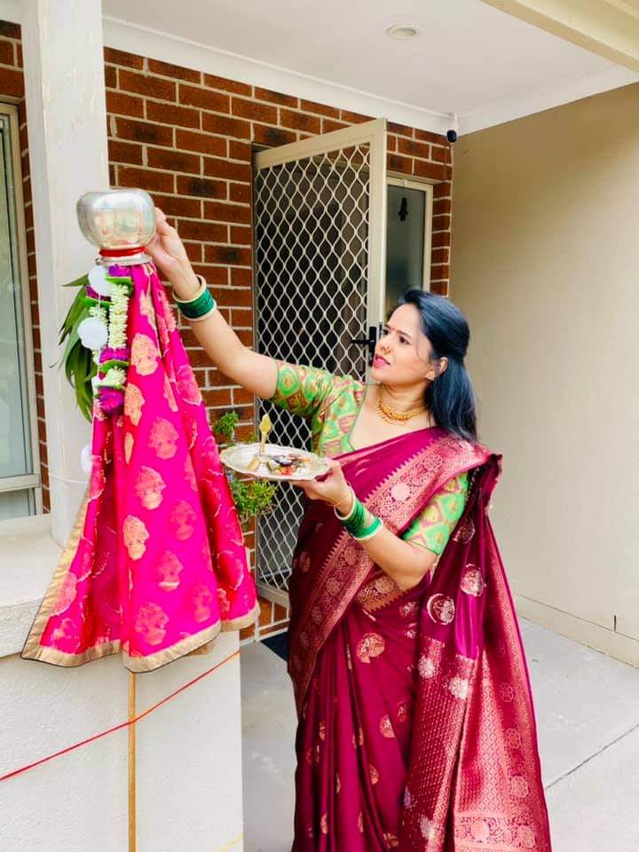3. स्वस्तिक के केन्द्र में हल्दी और कुमकुम अर्पण करें।विभिन्न स्थलों में गुड़ी पड़वा आयोजन