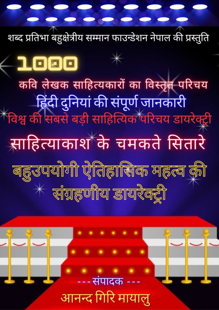 नेपाल की प्रसिद्ध संस्था ” शब्द प्रतिभा बहुक्षेत्रीय सम्मान फाउन्डेशन नेपाल ” द्वारा विश्व स्तरीय जानकारी के साथ एक ऐतिहासिक महत्व की संग्रहणीय डायरेक्ट्री के रूप में इसका प्रकाशन किया जा रहा है। विगत 5 वर्षों से एक टीम इस डायरेक्ट्री प्रकाशन की योजना पर कार्य कर रही है। संस्थान के अध्यक्ष तथा डायरेक्ट्री के संपादक आनन्द गिरि मायालु कहते हैं – ” विश्व में देवनागरी लिपि तथा हिंदी भाषा साहित्य कला और संस्कृति के क्षेत्र में सैकड़ों व्यक्ती तथा संस्थाओं द्वारा उल्लेखनीय योगदान दिया जा रहा है परंतु ऐसी प्रतिभाएं और संस्थाएं ओझल में है ऐसी प्रतिभाओं और संस्थाओं के उल्लेखनीय कार्य को विश्व स्तर पर पहचान दिलाने के लिए इस डायरेक्ट्री का प्रकाशन किया जा रहा है। सूरीनाम की राजधानी पारामारिबो में 5 से 9 जून 2003 में सातवां (21वीं शताब्दी के पहला) विश्व हिंदी सम्मेलन आयोजित किया गया था। जिसमें हिंदी विद्वानों की एक विश्व निर्देशिका प्रकाशन का प्रस्ताव पारित किया था। इस प्रकाशन कार्य को मूर्त रूप देने के लिए इस ऐतिहासिक गौरवशाली ” साहित्याकाश के चमकते सितारे ” नाम को डायरेक्ट्री का प्रकाशन किया जा रहा है।”