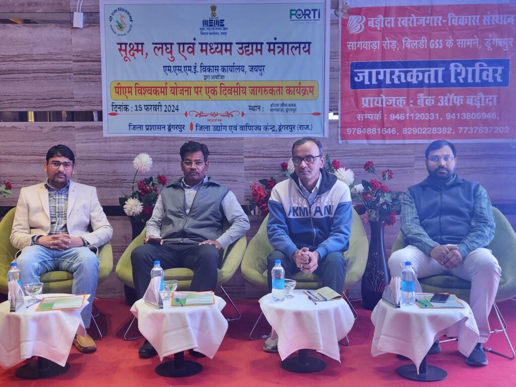 जयपुर,डूंगरपुर जिले के सागवाड़ा कस्बे में प्रधानमंत्री विश्वकर्मा योजना पर फेडरेशन ऑफ राजस्थान ट्रेड एंड इंडस्ट्री(फोर्टी ) और एमएसएमई विभाग की ओर से कार्यशाला का आयोजन किया गया। इसमें एसडीएम श्रवण सिंह राठौड़, जिला उद्योग केंद्र के महाप्रबंधक हितेश जोशी, एमएसएमई विभाग के सहायक निदेशक संजय मीणा और फोर्टी के शाखा कमेटी चेयरमैन प्रवीण सुथार के साथ क्षेत्र के 18 श्रेणियों से संबंधित कारीगरों ने भाग लिया। इस मौके पर कारीगरों को प्रशिक्षण ,टूल किट और ऋण वितरण के साथ प्रधानमंत्री विश्वकर्मा योजना में रजिस्ट्रेशन और जेम पोर्टल की जानकारी भी दी गई।फोर्टी ब्रांच चेयरमैन प्रवीण सुथार का कहना है कि ज्यादा से ज्यादा कारीगरों को प्रधानमंत्री विश्वकर्मा योजना से जुड़कर इसका लाभ उठाना चाहिए। इस योजना से कारीगरों की उत्पादकता और कार्यक्षमता दोनों का विस्तार होगा l