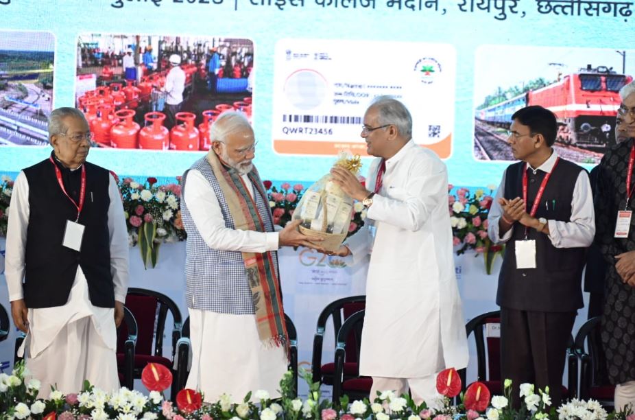 रायपुर,। प्रधानमंत्री नरेन्द्र मोदी शुक्रवार को छत्तीसगढ़ की राजधानी रायपुर पहुंचे। यहां उन्होंने 7,600 करोड़ रुपये की दस परियोजनाओं का उद्घाटन और शिलान्यास किया। 2019 में दूसरे कार्यकाल के लिए प्रधानमंत्री चुने जाने के बाद यह छत्तीसगढ़ में मोदी की पहली यात्रा है। राज्य में इस साल के अंत में विधानसभा चुनाव होने हैं। पीएम मोदी के साथ मंच पर पांच केंद्रीय मंत्री और मुख्यमंत्री भूपेश बघेल भी मौजूद रहे। प्रधानमंत्री ने कार्यक्रम के दौरान आयुष्मान भारत योजना के तहत लाभार्थियों को 75 लाख कार्डों के वितरण की शुरुआत भी की।
