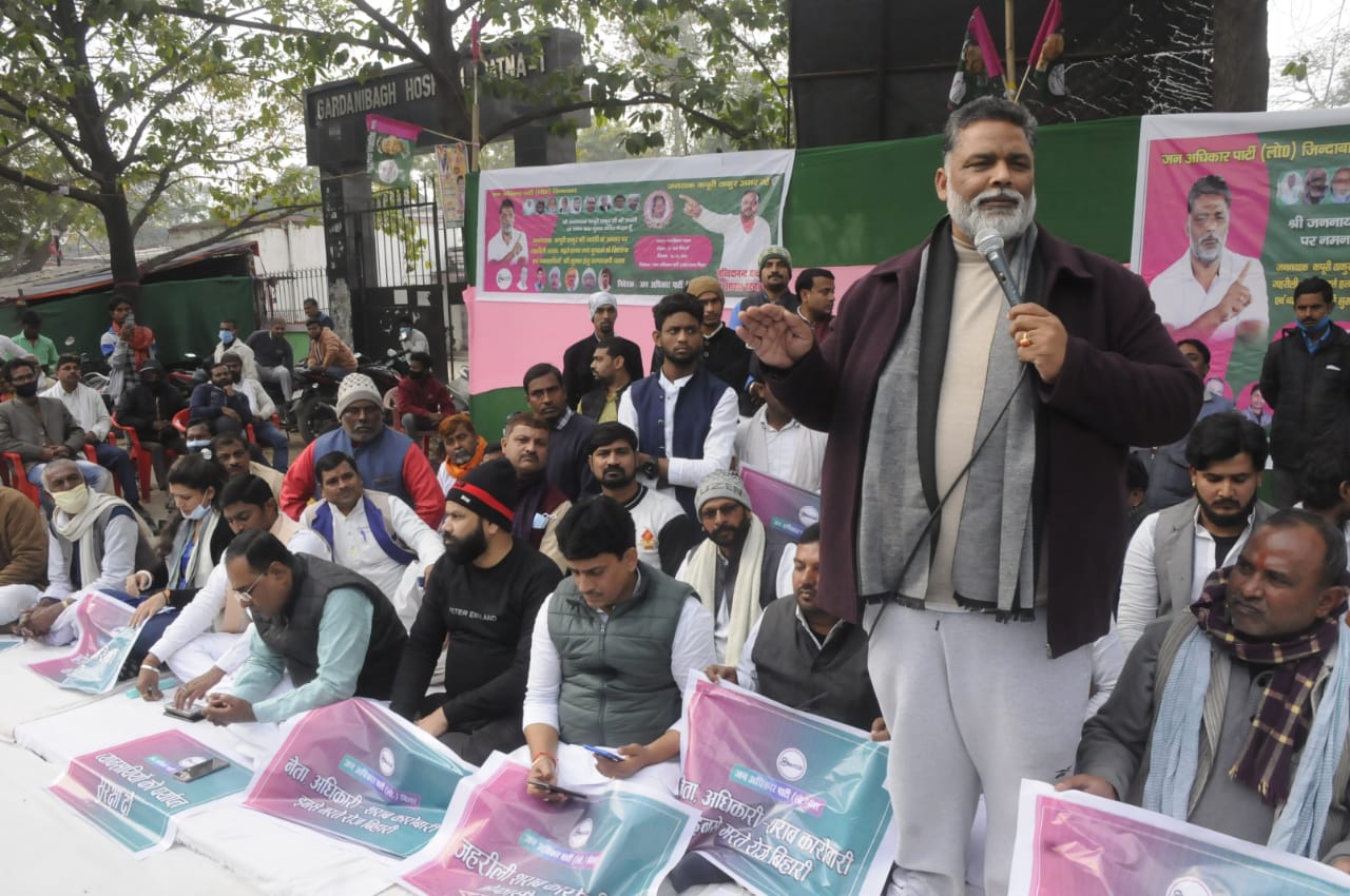 पटना : जन नायक कर्पूरी ठाकुर की जयंती के अवसर पर आज जन अधिकार पार्टी के राष्ट्रीय अध्यक्ष पप्पू यादव के नेतृत्व में जहरीली शराब, बढ़ते हत्या व दुष्कर्म एवं व्यवसायियों की सुरक्षा हेतु जाप द्वारा पटना के गर्दनीबाग धरनास्थल पर धरना दिया गया. इस दौरान जाप सुप्रीमो पप्पू यादव ने कहा कि सूबे में जहरीली शराब से सैकड़ों लोगों की मौत हो चुकी है और पूरे मामले में कार्रवाई के नाम पर सरकार की तरफ से खानापूर्ति की जाती हैं. शराब के खेल में सत्ता पक्ष और विपक्ष के बड़े नेता शामिल हैं. इस मामले में सभी पक्षों के विधायक, सांसद, जिला परिषद अध्यक्ष, मुखिया, सरपंच की जिम्मेदारी तय होनी चाहिए. और इनके सम्पति की जांच होनी चाहिए.