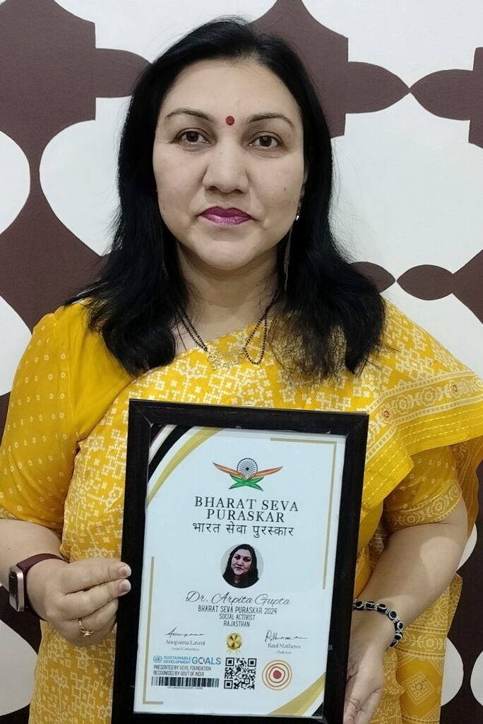 बीकानेर| कर्नाटक की वेईल ऑर्गनाइजेशन द्वारा देश की चुनिंदा विभूतियों को भारत सेवा पुरस्कार से नवाजा गया| जिसमें राजस्थान से एकमात्र बीकानेर की डॉ. अर्पिता गुप्ता का चयन किया गया|ऑर्गनाइजेशन के चेयरमैन रॉल मैथ्यू ने बताया सोशल मीडिया के माध्यम से उनकी कमेटी ने डॉ.अर्पिता गुप्ता का चयन उनके द्वारा लंबे समय से लगातार समर्पण भाव से सामाजिक कार्य करते रहने के लिए जिसमें निजी स्तर पर संचालित ग्रामीण व शहरी बालिकाओं व महिलाओं की शिक्षा,स्वास्थ्य, सुरक्षा व आत्मनिर्भरता के क्षेत्र में उत्कर्ष सेवाएं, युवा सशक्तिकरण, एंटी करप्शन प्रोजेक्ट, एंटी रैगिंग प्रोजेक्ट्स, देह दान के प्रति जागरूकता, निशुल्क ऑनलाइन कक्षाओं के माध्यम से देश भर के बच्चों को विभिन्न प्रशिक्षण देने को देखकर किया गया है|