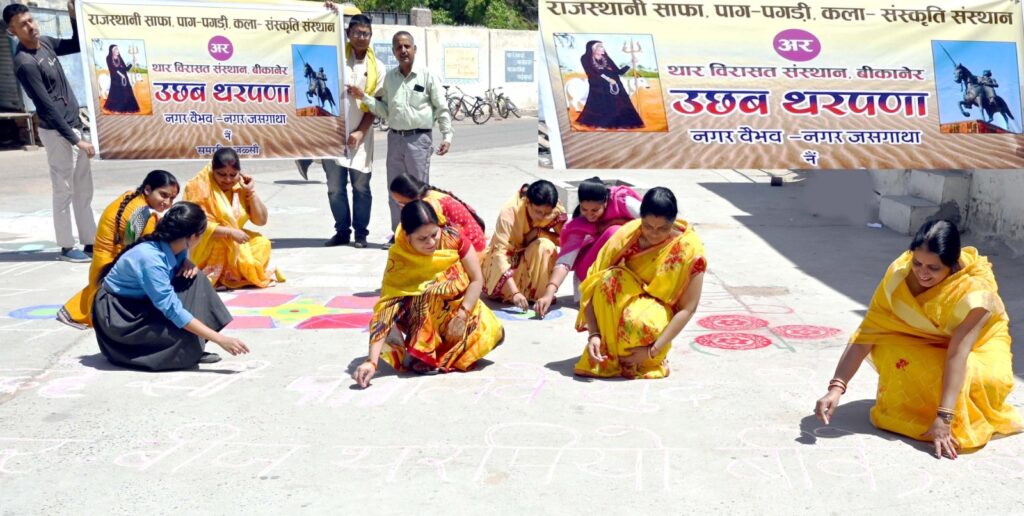 बीकानेर, । नगर वैभव एवं नगर की यश गाथा को समर्पित ‘उछब थरपणा’ समारोह के दूसरे दिन आज नत्थूसर गेट के बाहर स्थित सृजन सदन परिसर में प्रातः 9 बजे हमारी लोक कलाओं एवं लोक संस्कृति की विरासत रंगोली-मांडणा को लगभग 70ग70 फुट के समचौरस परिसर में विभिन्न मनमोहक रंगों में उकेरने के लिए महिलाओं और बालिकाओं में गजब का उत्साह था। अवसर था राजस्थानी साफा, पाग-पगड़ी, कला-संस्कृति संस्थान एवं थार विरासत की ओर से आयोजित ‘उछब थरपणा’ के समारोह का।