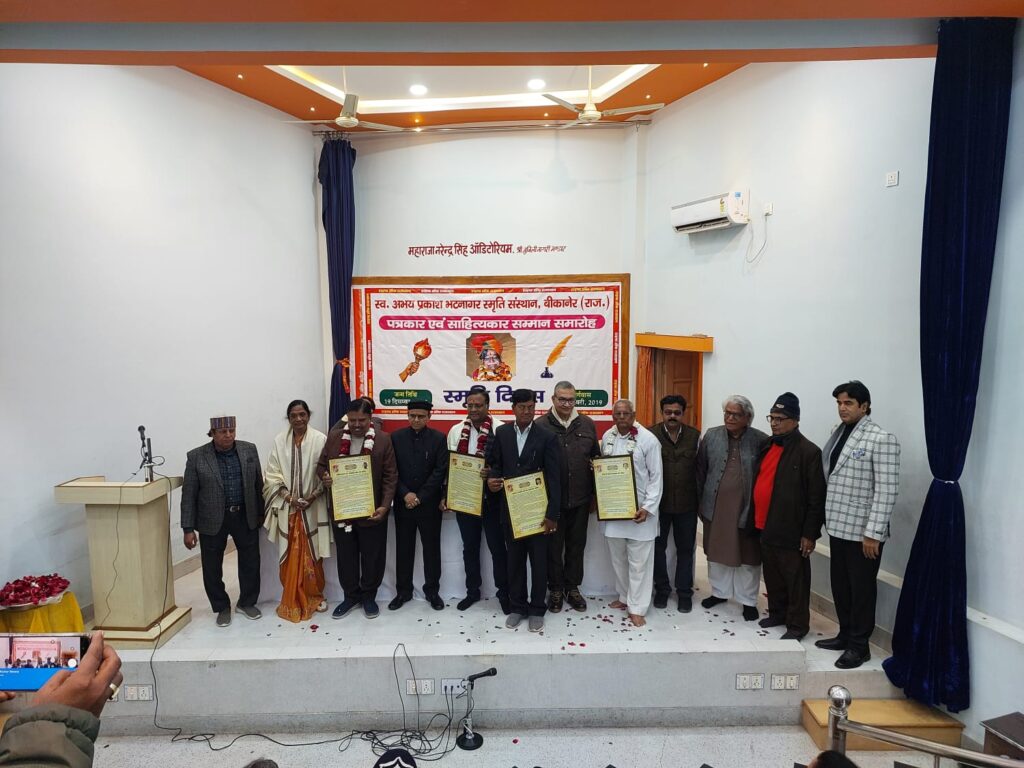 बीकानेर,टाइम्स ऑफ राजस्थान समाचार पत्र के निर्भीक पत्रकार स्वर्गीय अभय प्रकाश भटनागर की पांचवीं पुण्यतिथि के अवसर पर स्वर्गीय अभय प्रकाश भटनागर स्मृति संस्थान बीकानेर द्वारा उनकी स्मृति में महाराजा नरेंद्र सिंह ऑडिटोरियम नागरी भण्डार में नगर के दो वरिष्ठ साहित्यकारों विशन मतवाला, डॉ. उमाकांत गुप्त एवं वरिष्ठ पत्रकारों हेम शर्मा एवं हरीशंकर आचार्य का शॉल, श्रीफल, प्रतीक चिन्ह, अभिनन्दन-पत्र, माला एवं श्रीफल अतिथियों व गणमान्य लोगों द्वारा अर्पित कर सम्मानित किया गया।