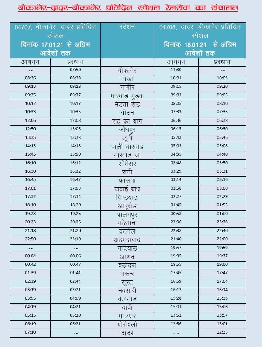 गाडी संख्या 04707 बीकानेर-दादर प्रतिदिन स्पेशल रेलसेवा दिनांक 17.01.21 से अग्रिम आदेशों तक बीकानेर से प्रतिदिन 07.50 बजे रवाना होकर अगले दिन 07.10 बजे दादर पहुॅचेगी। इसी प्रकार गाडी संख्या 04708, दादर-बीकानेर प्रतिदिन स्पेशल रेलसेवा दिनांक 18.01.21 से अग्रिम आदेशों तक दादर से प्रतिदिन 12.35 बजे रवाना होकर अगले दिन 11.30 बजे बीकानेर पहुॅचेगी।यह रेलसेवा मार्ग में नोखा, नागौर, मारवाड मुंडवा, मेडता रोड, गोटन, राई का बाग, जोधपुर, लूनी, पाली मारवाड, मारवाड जं., सोमेसर, रानी, फालना, जवाई बांध, पिण्डवाडा, आबूरोड, पालनपुर, महेसाना, कलोल, अहमदाबाद, नदियाड, आणंद, वडोदरा, भरूच, सूरत, नवसारी, वलसाड, वापी, पालघर एवं बोरीवली स्टेशनों पर ठहराव करेगी। बीकानेर जिला उद्योग संघ के अध्यक्ष द्वारकाप्रसाद पचीसिया, जेड आर यू सी सी सदस्य नरेश मित्तल, यात्री सेवा समिति के अध्यक्ष रामकिशोर रावत, डॉ एस एन हर्ष, अनंतवीर जैन व भगवती प्रसाद पारीक ने रेल मंत्री पीयूष गोयल, केंद्रीय राज्यमंत्री अर्जुनराम मेघवाल, रेलवे बोर्ड, महाप्रबंधक उत्तर पश्चिम रेलवे एवं मंडल रेल प्रबंधक उत्तर पश्चिम रेलवे बीकानेर मंडल का आभार प्रकट किया ।