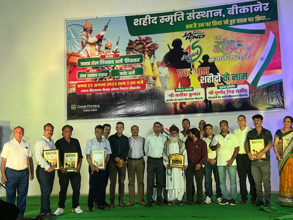 बीकानेर।स्वतन्त्रता दिवस के उपलक्ष्य में शहीद स्मृति संस्थान, बीकानेर और रोटरी क्लब बीकानेर रॉयल्स के संयुक्त तत्वाधान में देशभक्ति गीतों का कार्यक्रम एक शाम शहीदों के नाम बी एस एफ…